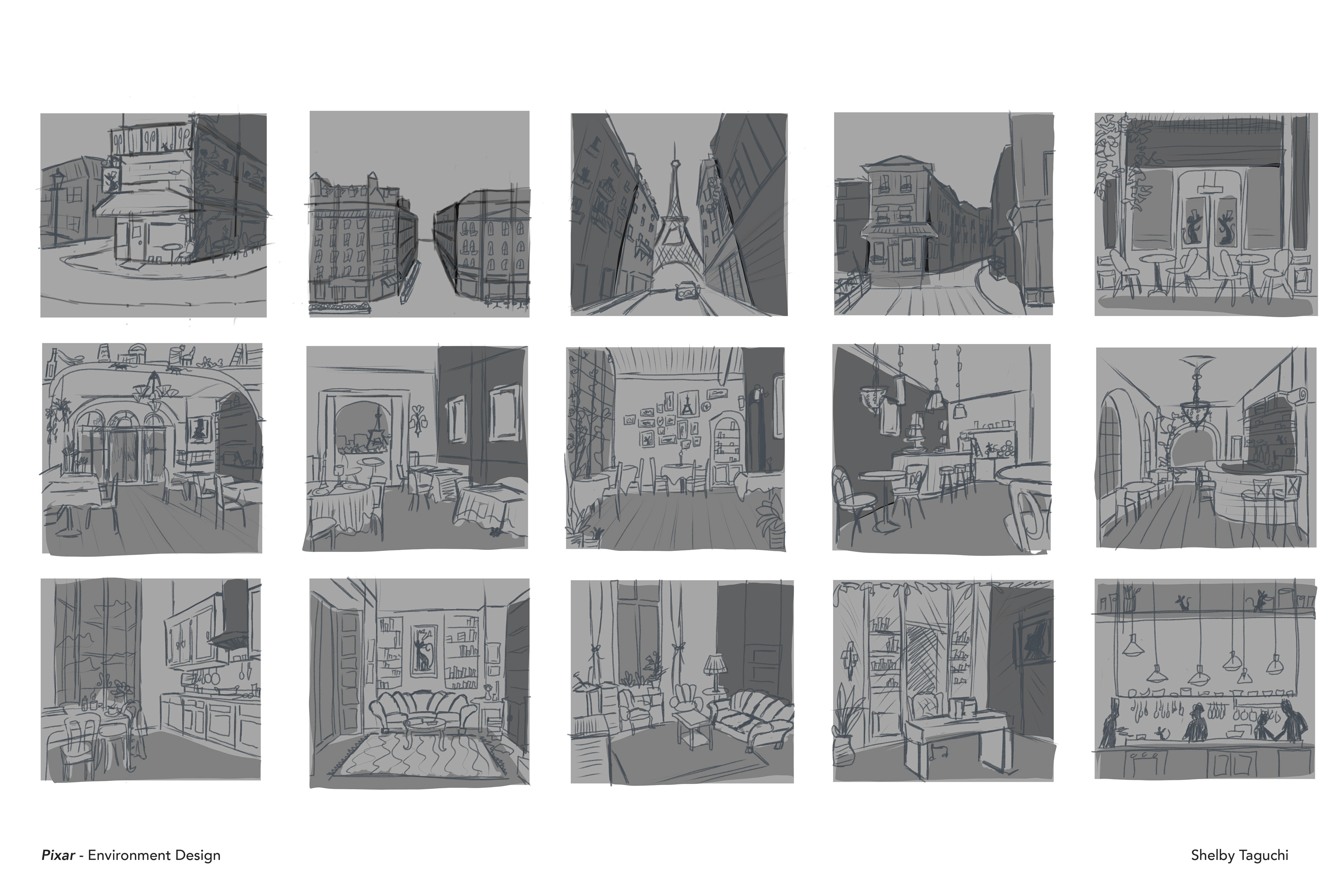 : Create new environment that would fit into the world of Pixar, Ratatouille. Exploration of different scenes in Paris and creating a new living space.