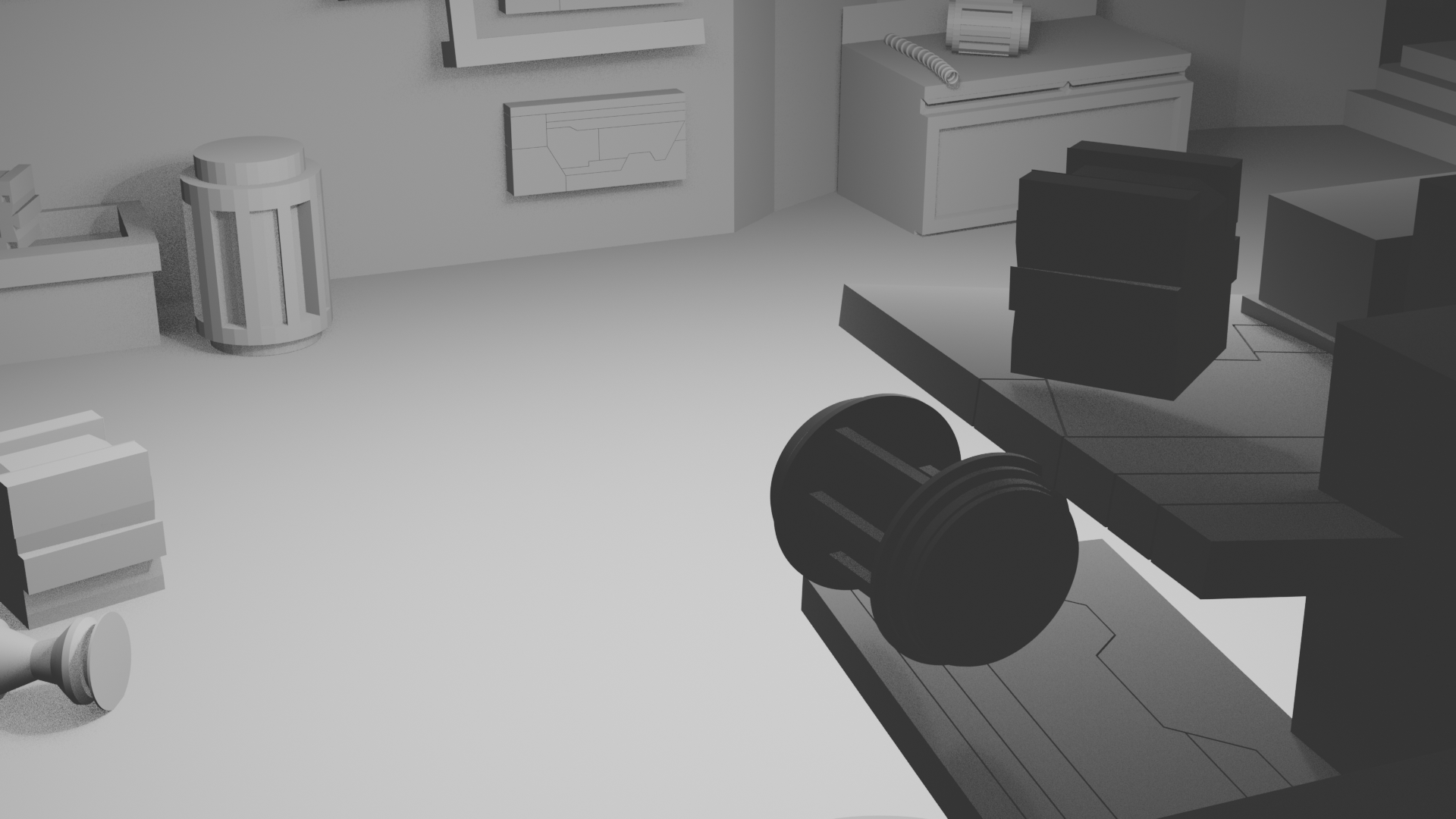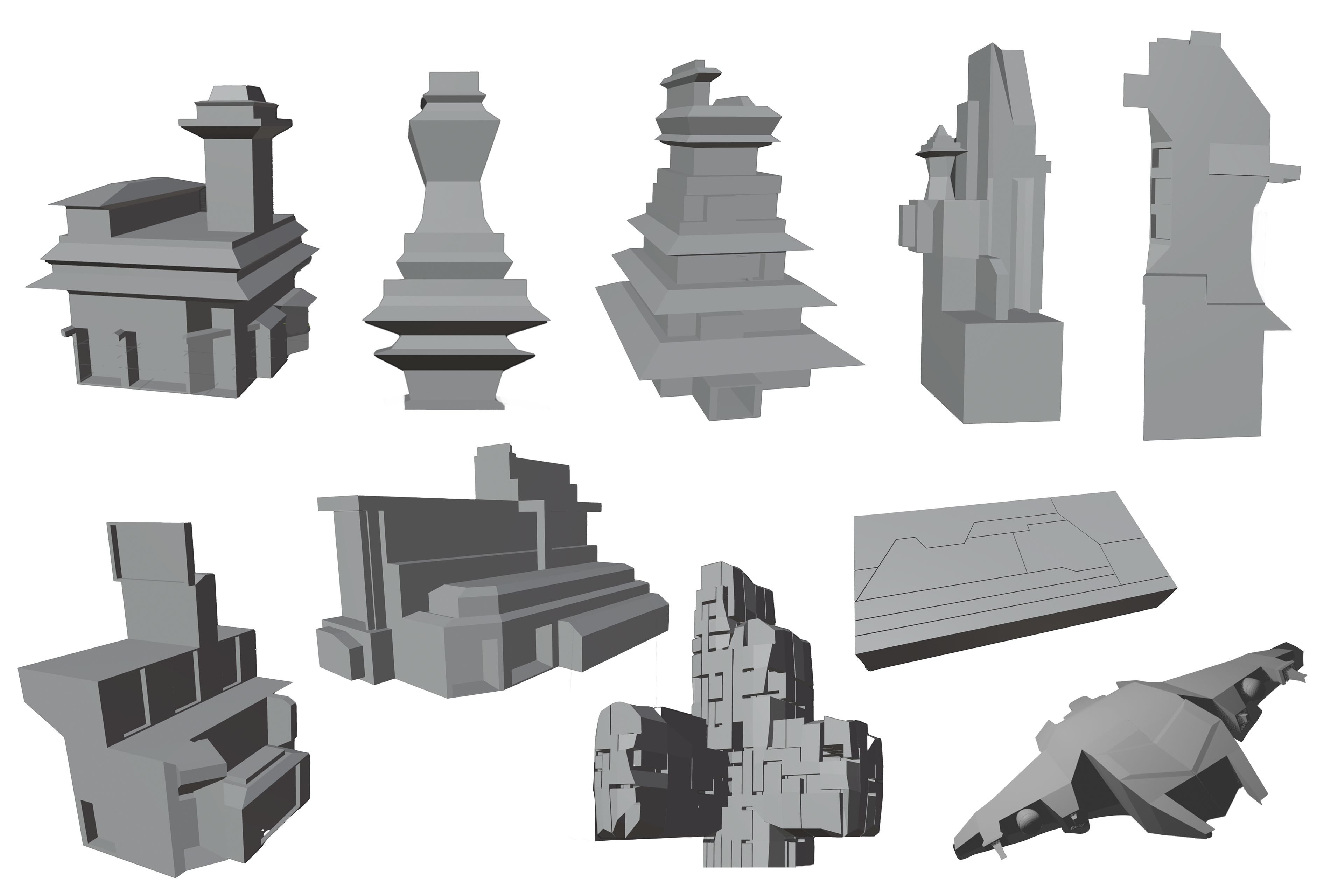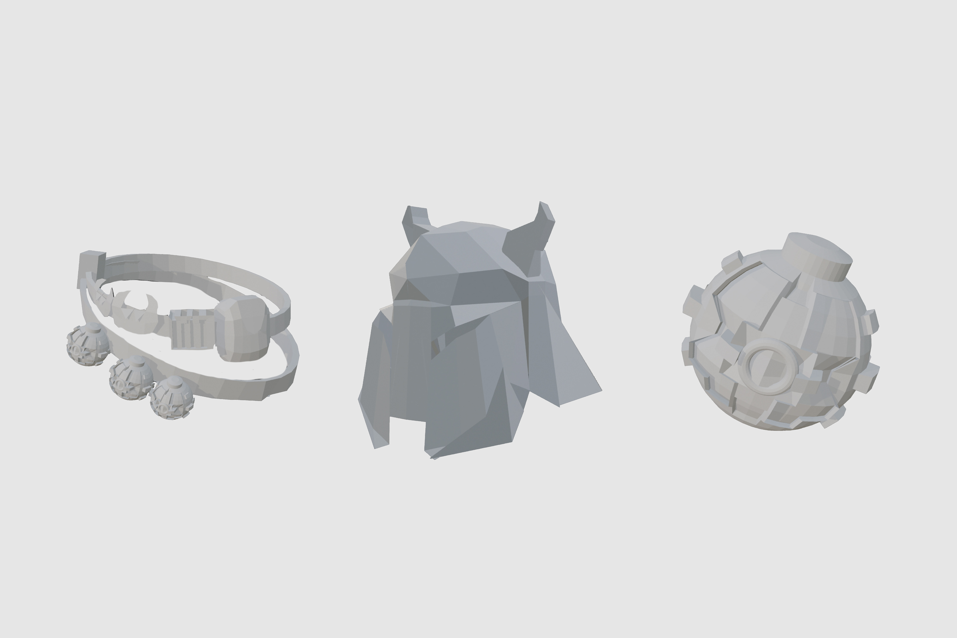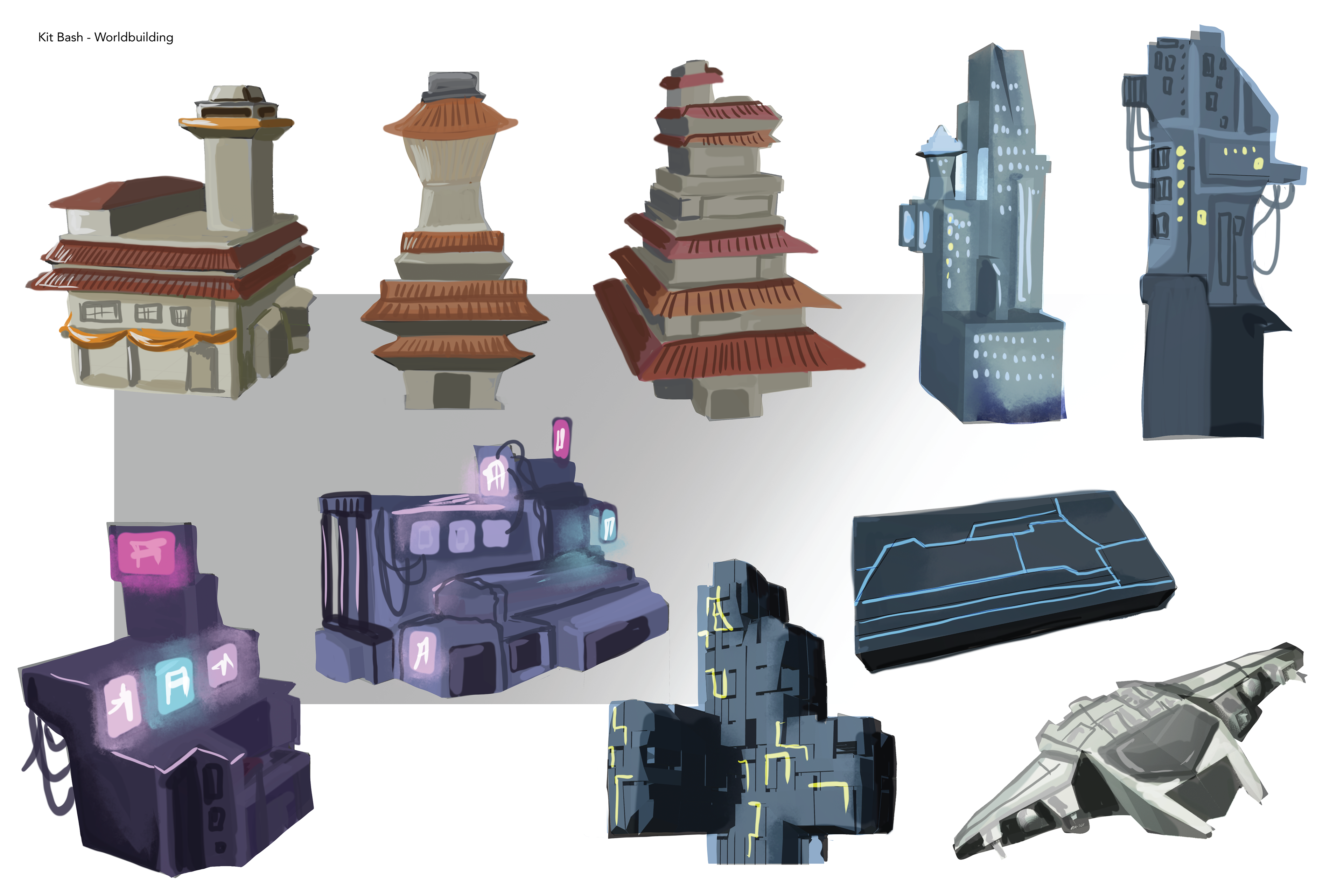Creating a kit bash was crucial to have elements to reusue, in the world I was creating. This was my first time using Blender and exploring the 3D modeling world. I created my own helmets, grenades, tool belt, ships and even buildings for the environment.